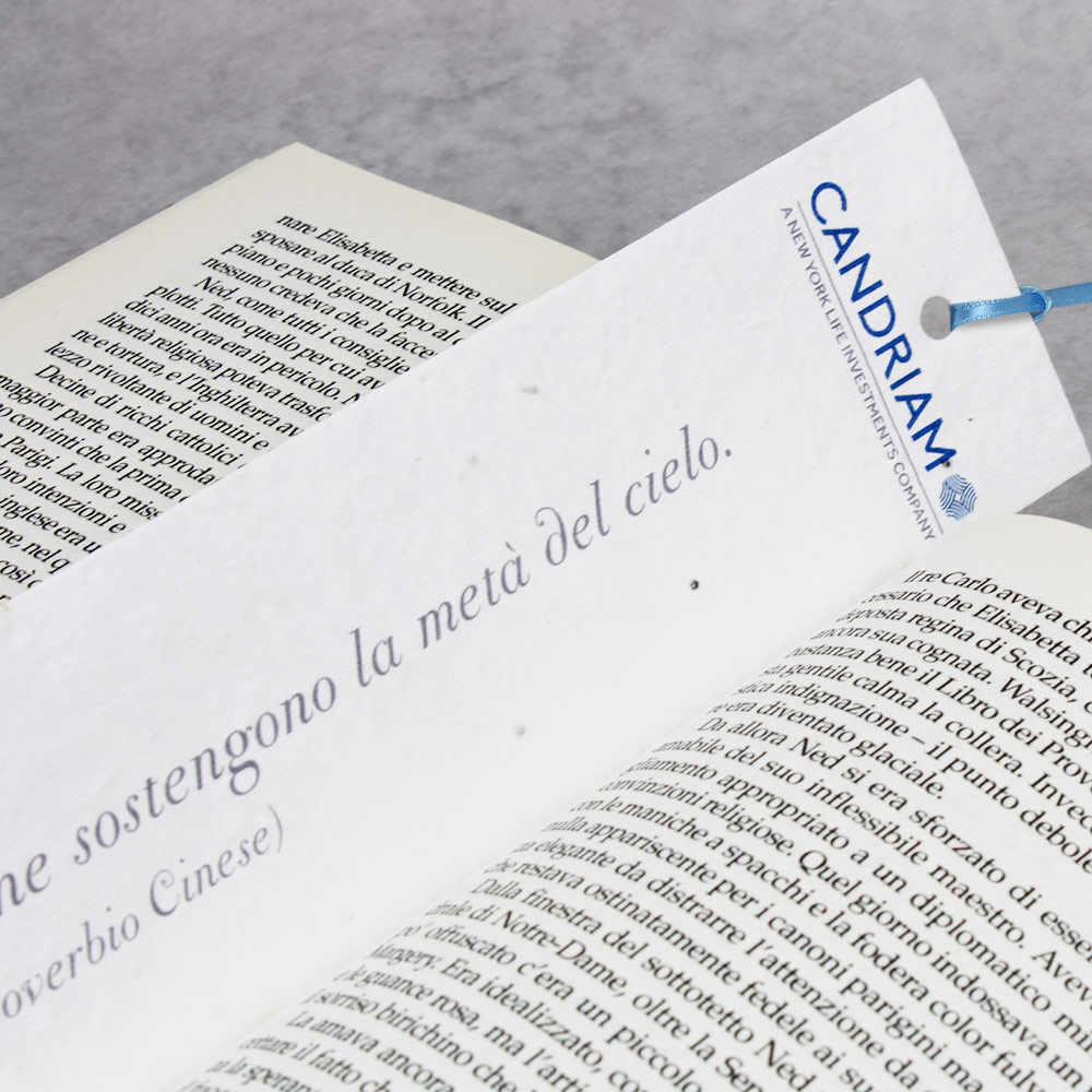 Come main partner di un’evento internazionale dedicato alla parità di genere, Candriam ha voluto omaggiare gli ospiti con un fine SEGNALIBRO in carta semi, sul quale, grazie ad un intervento manuale, è stato ulteriormente aggiunto un richiamo distintivo all’azienda.