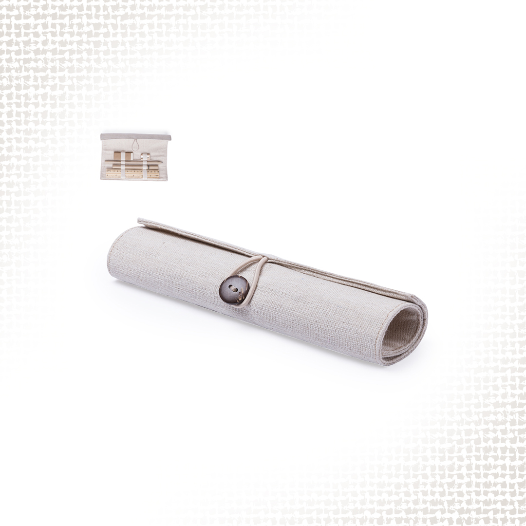 Originale astuccio della linea natura. Realizzato in juta e cotone, con elegante chiusura a bottone. Contiene 5 pezzi dalla finitura naturale: gomma, temperamatite e penna in cartone riciclato, con matita e righello in legno.