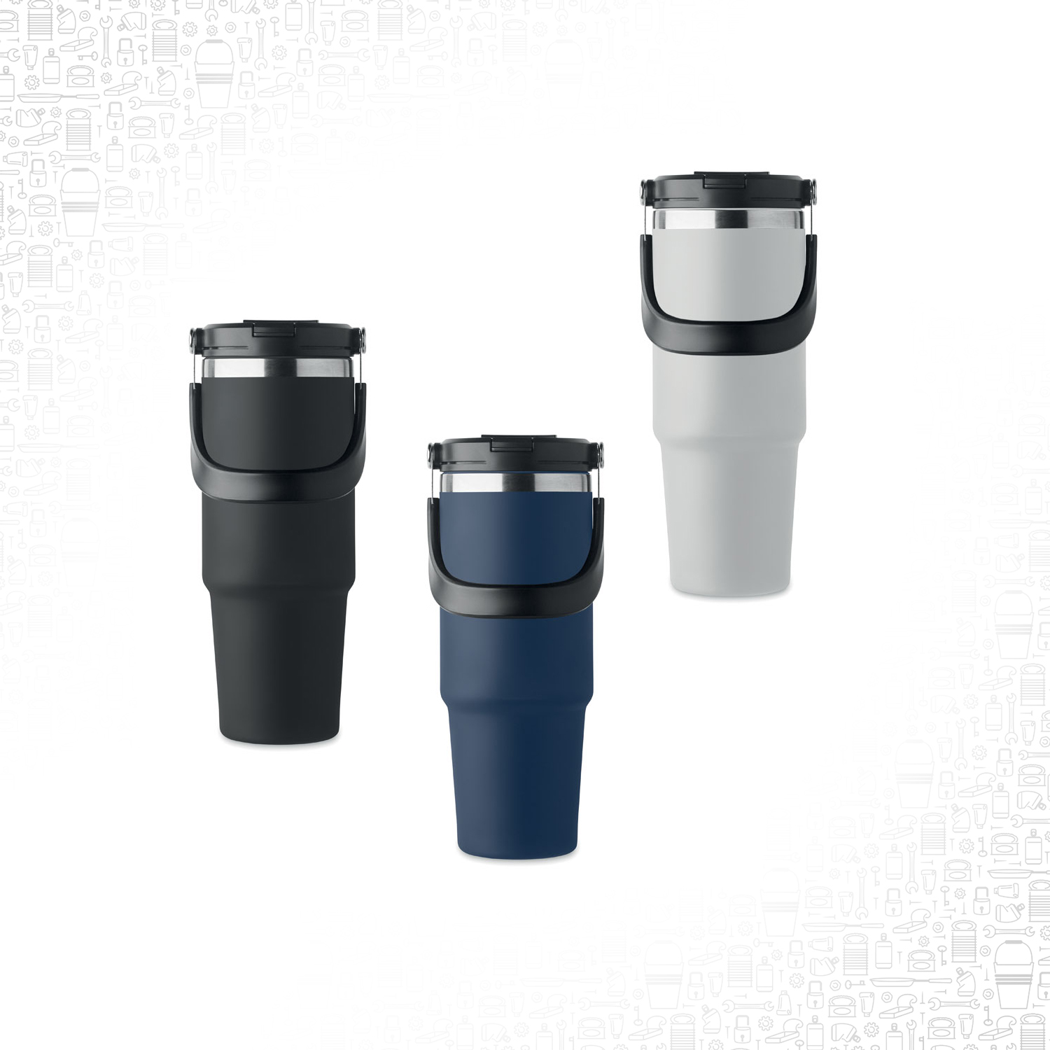 Bicchiere a doppio strato in acciaio inox riciclato (90% acciaio inox riciclato e 10% acciaio inox) con coperchio con cannuccia interna, imboccatura pieghevole e apertura per bere direttamente. Capacità 850 ml.