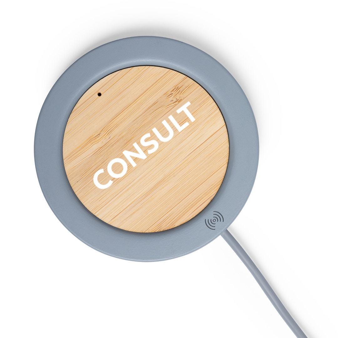 Caricabatterie wireless dal design circolare in bambù naturale e pietra cemento, un legante formato da una miscela di materiali naturali, principalmente calcare macinato e acqua, da cui si ottiene un materiale di grande consistenza e durata. Indicatore LED, cavo di ricarica USB abbinato.