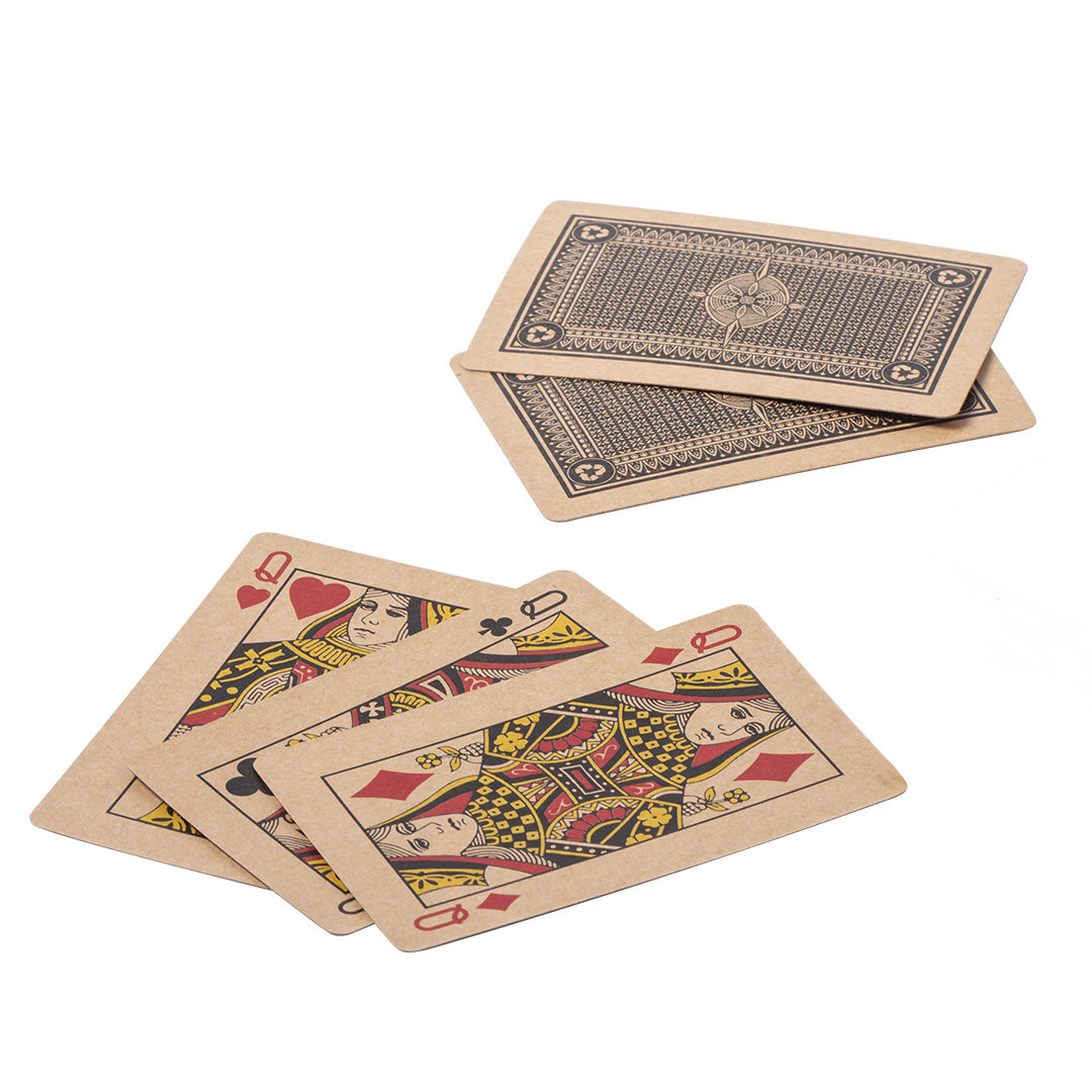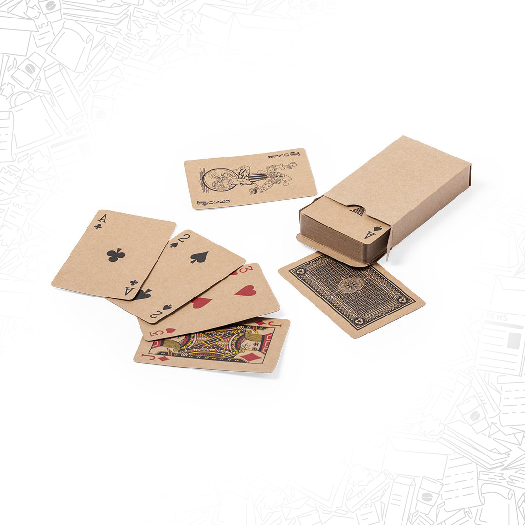Carte da gioco francesi fatte in cartone riciclato. Mazzo da 54 carte con custodia abbinata personalizzabile. Un divertente modo per lanciare il vostro brand.