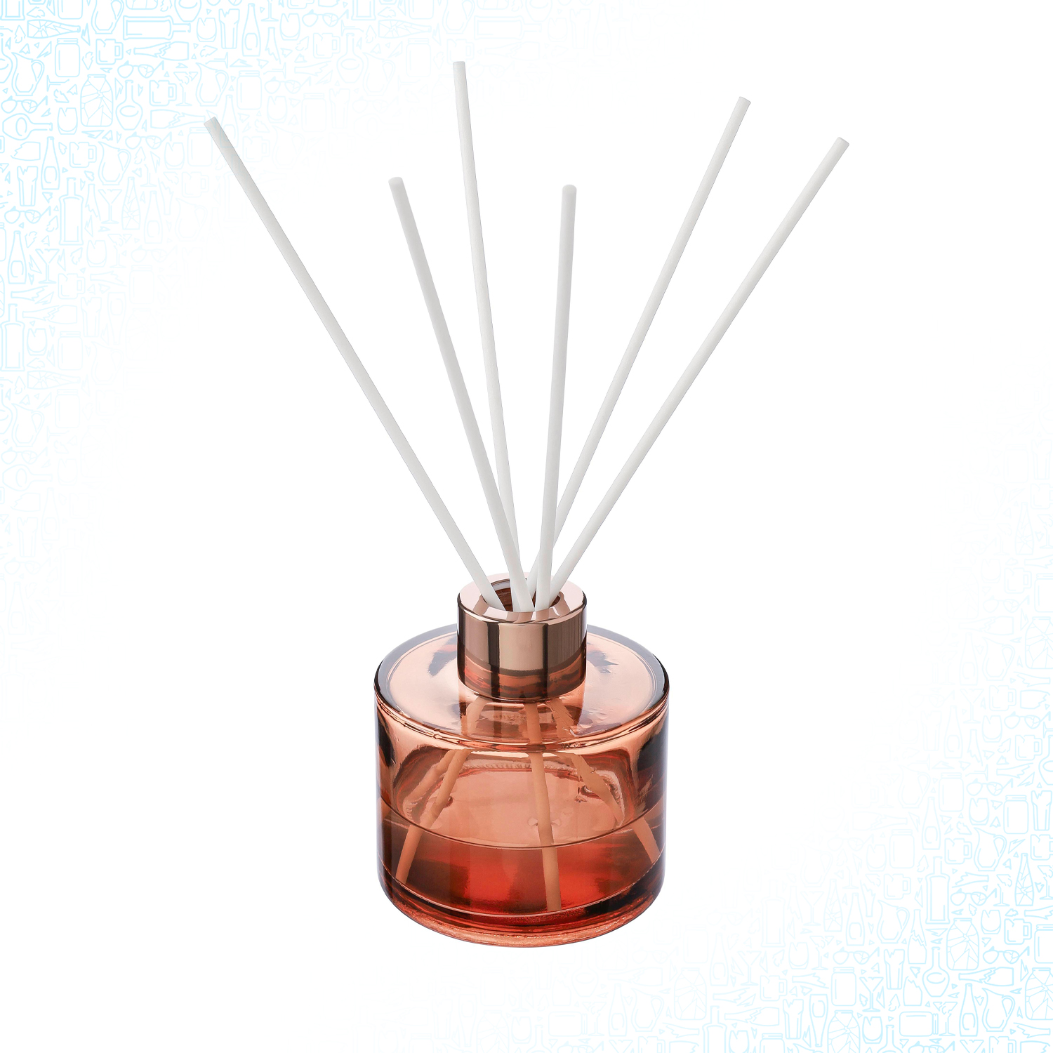 Diffusore in vetro con sei bastoncini in canna, il profumo varia in base al colore: marrone è il profumo del pino, bianco trasparente è il profumo del gelsomino, blu royal è il profumo dell’oceano, confezionato singolarmente in una scatola in cartone avana, capacità 100 ml