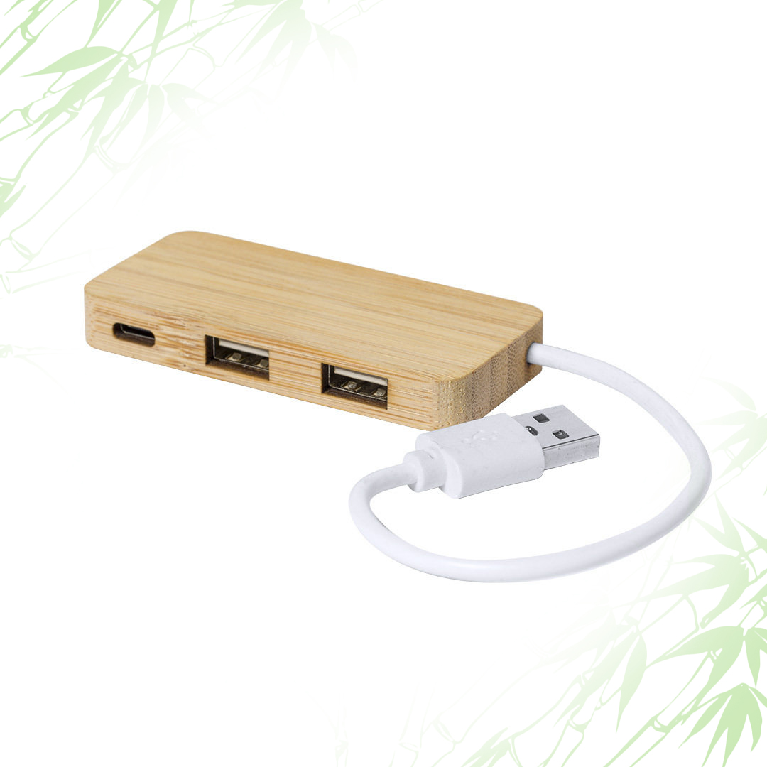 MultiPorta USB 2.0 realizzato in bamboo con tagli naturali. sono presenti 2 porte USB e 1 porta Type-C per tutti i vostri dispositivi. Presentato in un’attraente scatola di eco-design.