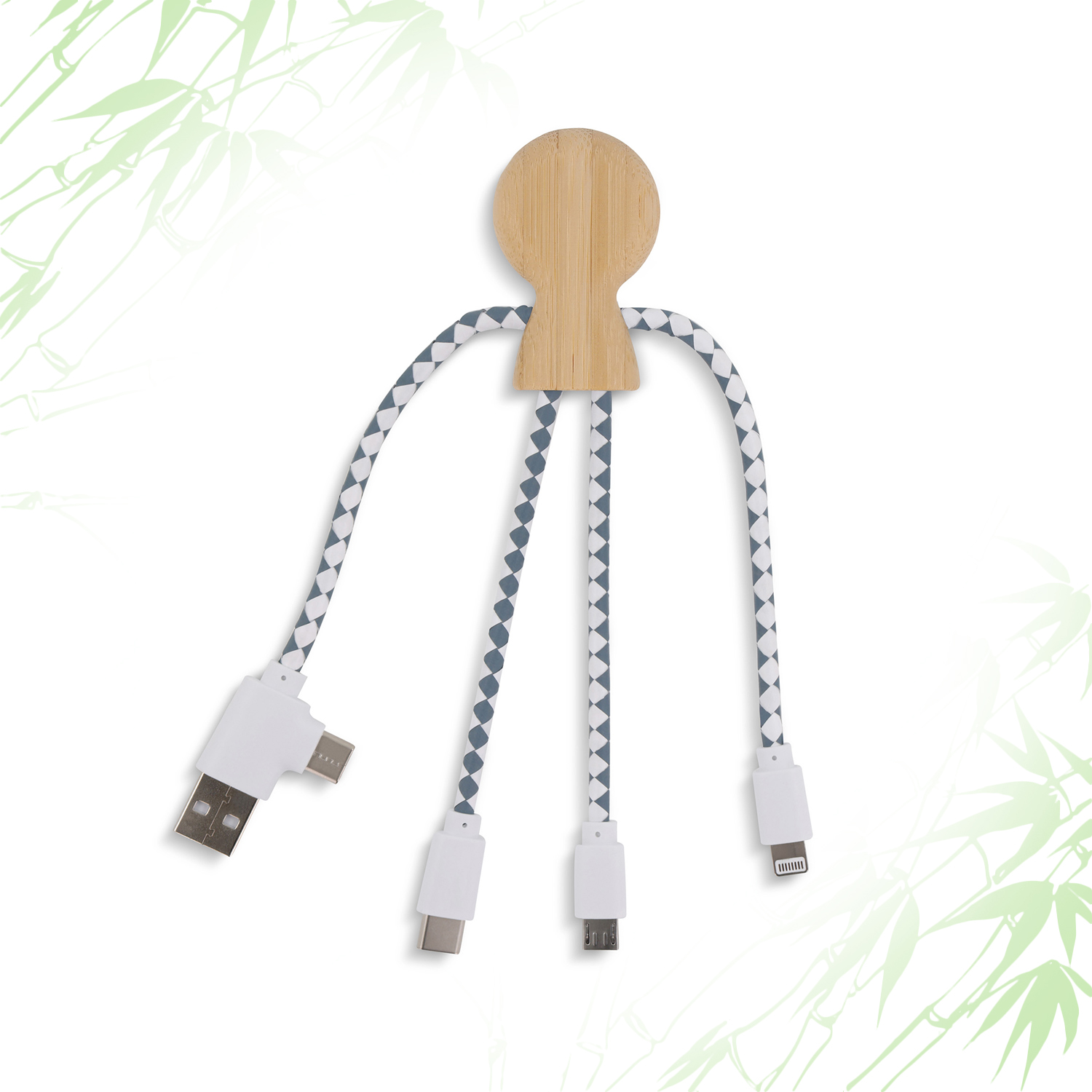 Mr. Bio Bamboo è il nostro più recente cavo di ricarica multipla, con un doppio connettore di ingresso USB e USB-C e tre connettori per ricaricare i dispositivi. È realizzato in bambù e cavi DuPont Tyvek. È confezionato in un’elegante busta di carta FSC sostenibile.
