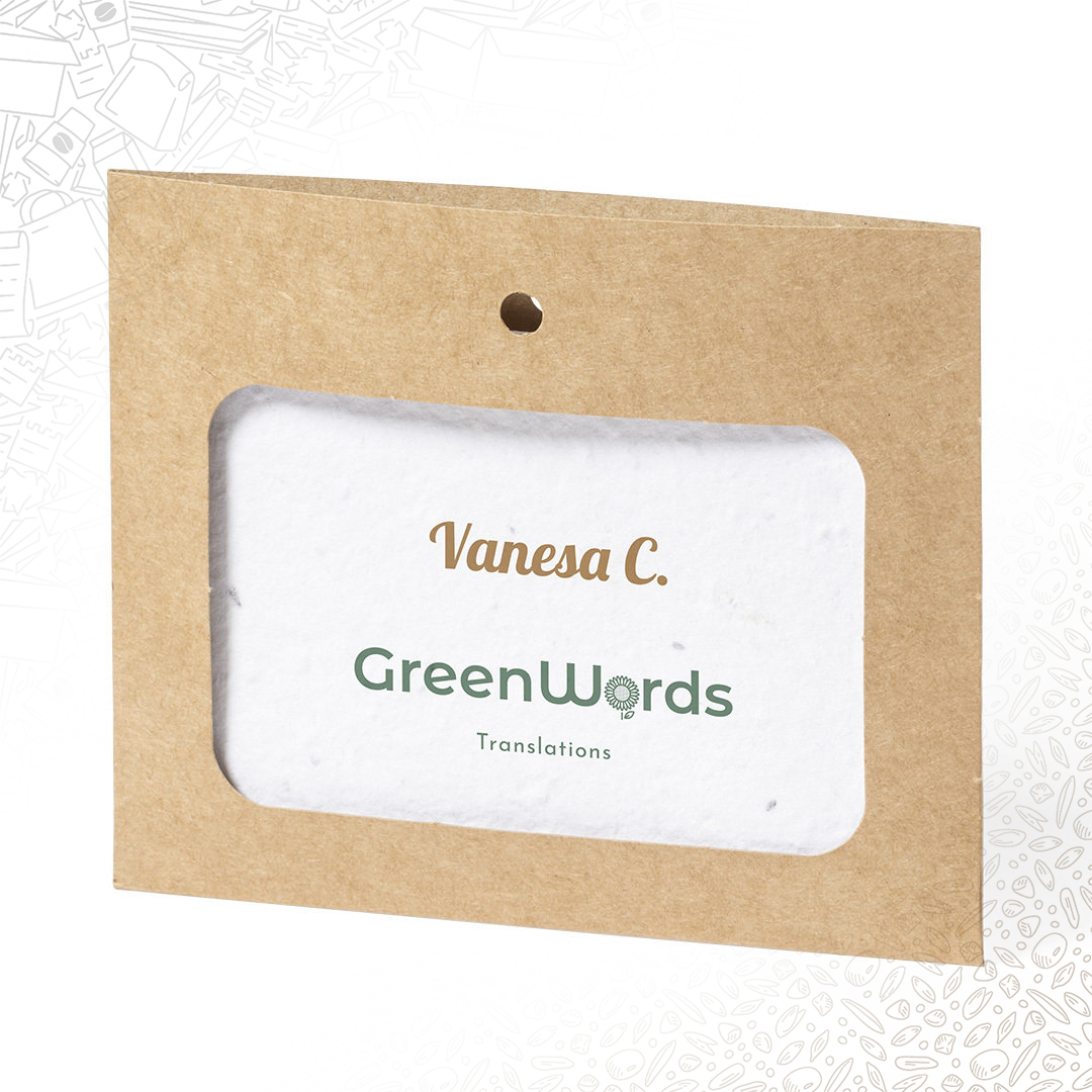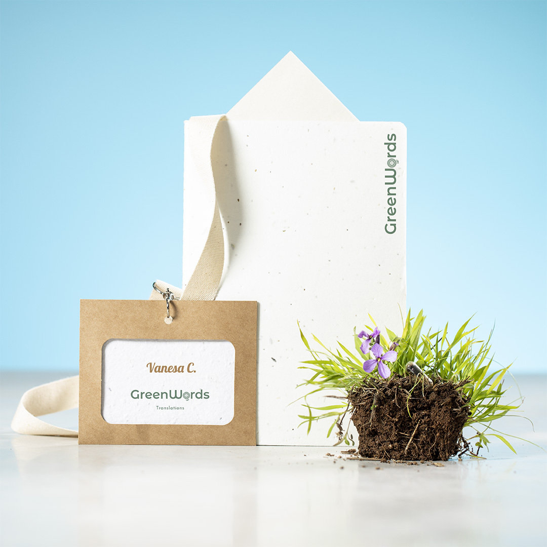 Portabadge in cartone riciclato contenente una card in carta semi da piantare! Al termine dell’utilizzo del badge, potrai seminare la cartolina all’interno del badge e veder nascere splendidi fiori.