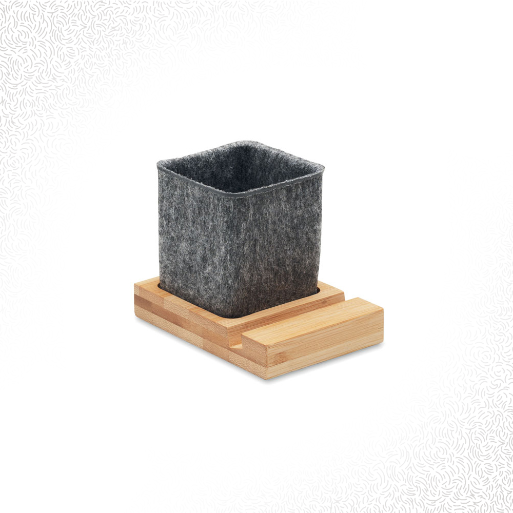 Portapenne in feltro RPET con base in bamboo e supporto per telefono.