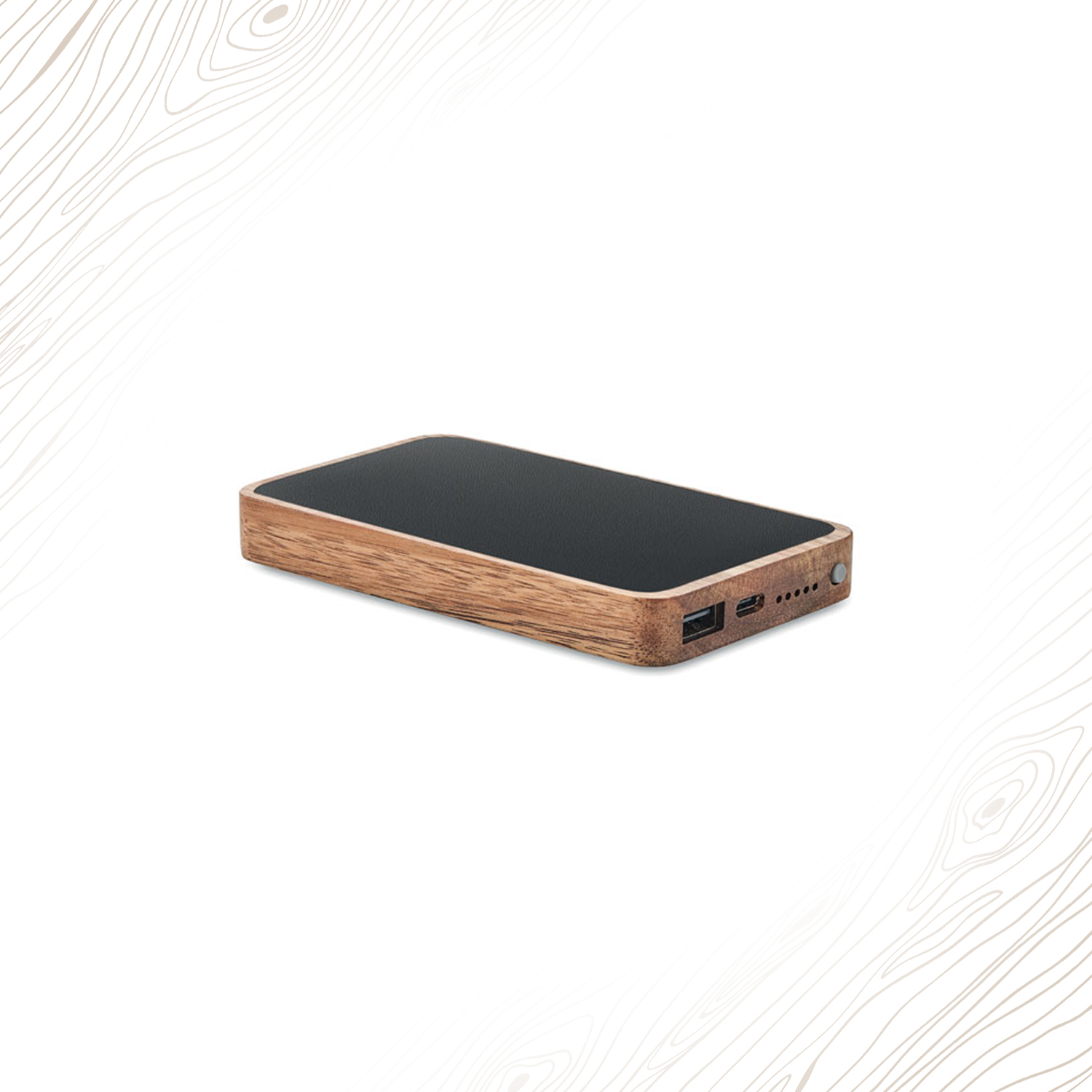 Ricarica wireless da 15W e power bank da 4000mAh con involucro in legno di acacia e PU riciclato. Supporta la tecnologia di ricarica rapida (20W). Ingresso/uscita: Tipo-C.