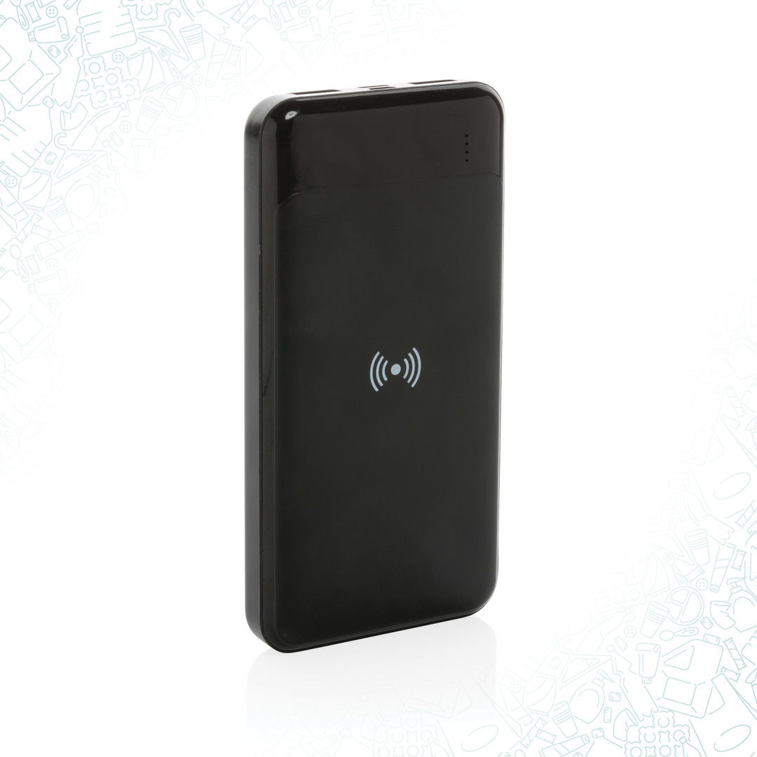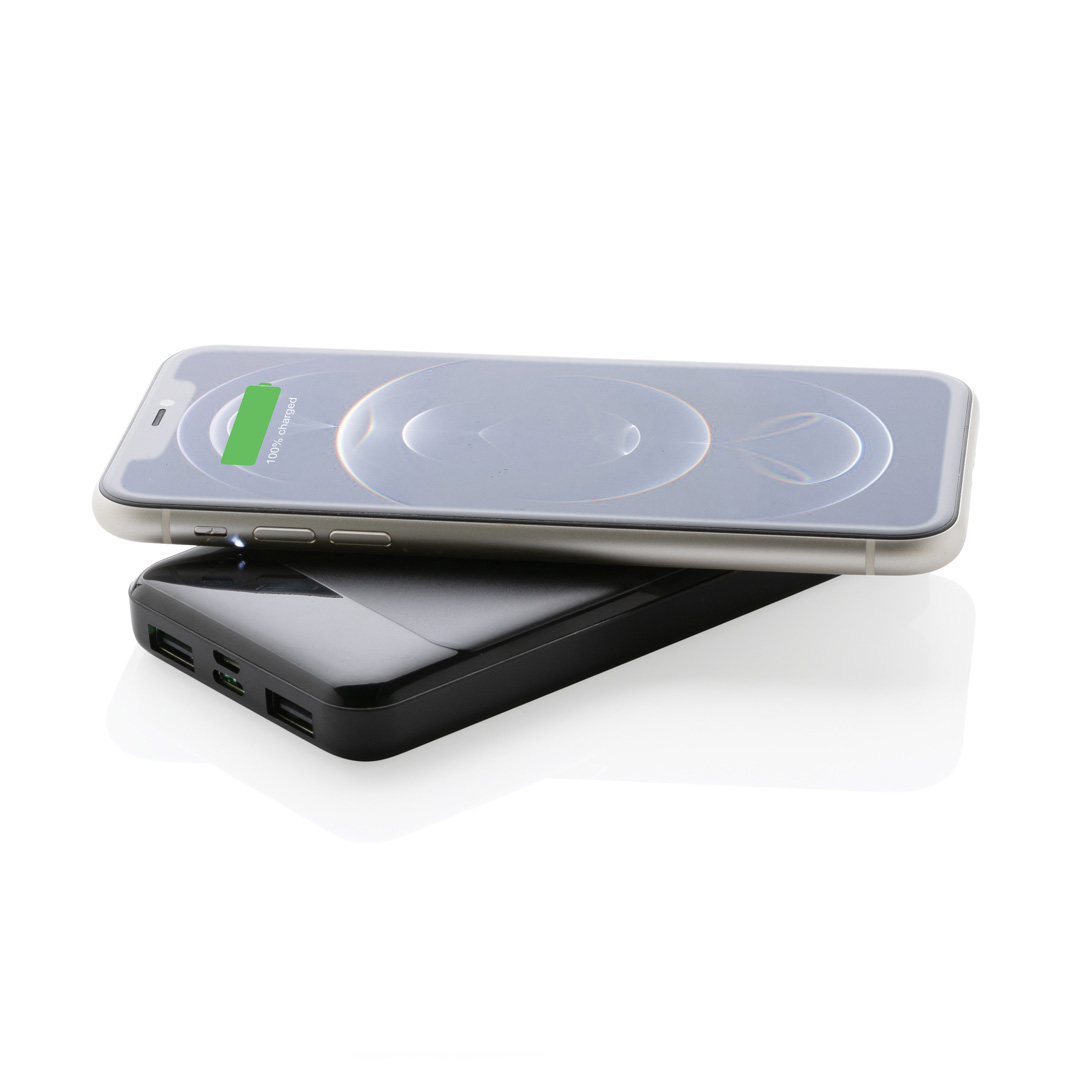 Powerbank da 8.000 mAh con caricabatterie wireless da 5W con custodia in ABS riciclata certificata RCS. RCS (Recycled Claim Standard) è lo standard che viene utilizzato quando una parte dell’articolo è stata realizzata con materiali riciclati. Quando è completamente carico, la powerbank ti fornisce energia sufficiente per ricaricare il tuo cellulare fino a quattro volte.