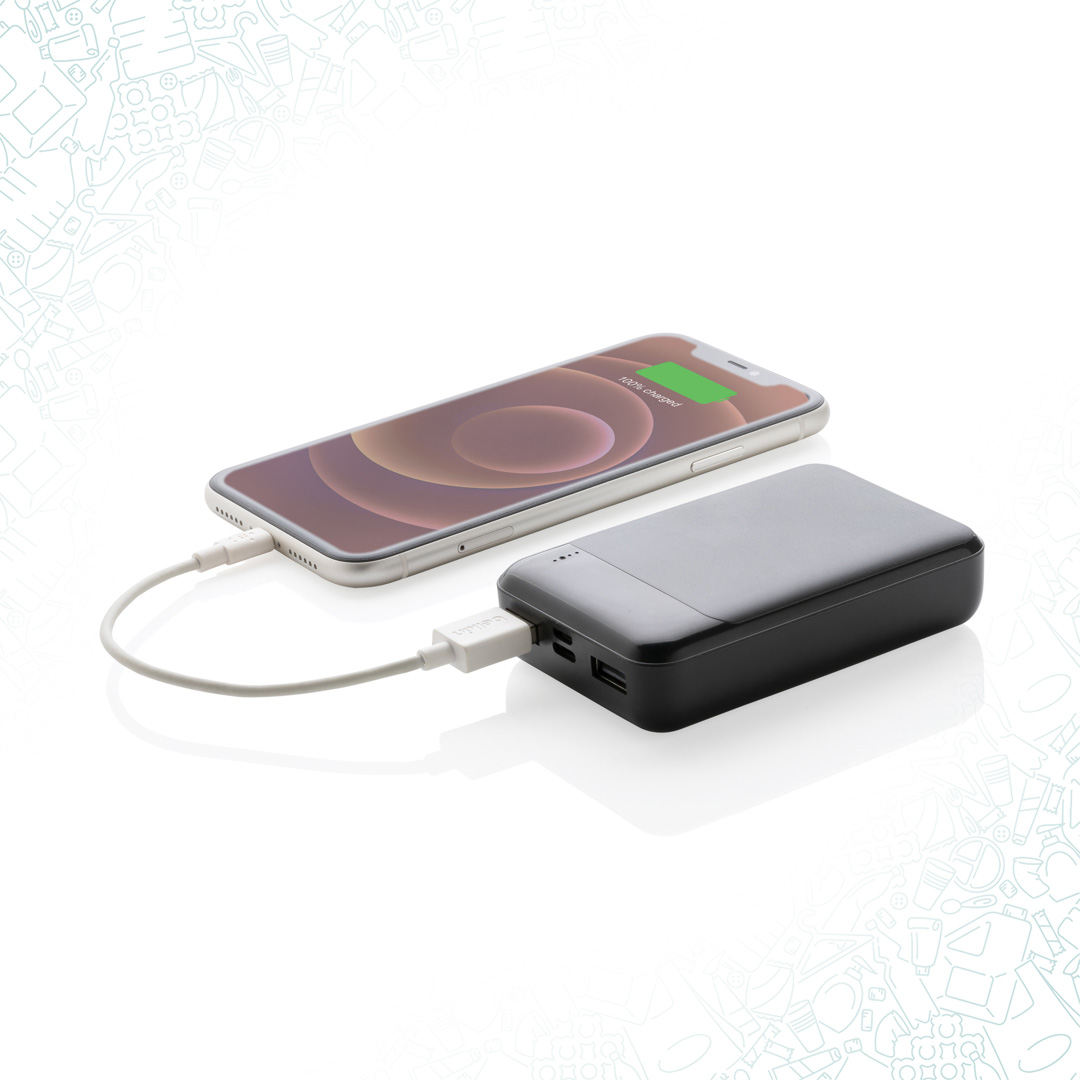 Powerbank tascabile da 10.000 mAh con custodia in ABS riciclata certificata RCS. RCS (Recycled Claim Standard) è lo standard che viene utilizzato quando una parte dell’articolo è stata realizzata con materiali riciclati. A piena carica, la powerbank ti fornisce energia sufficiente per ricaricare il tuo cellulare fino a cinque volte.