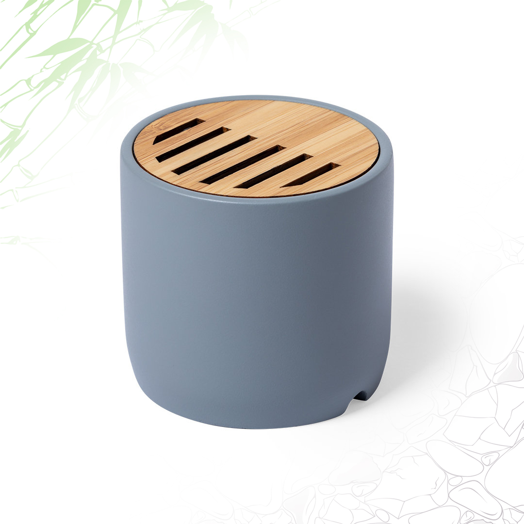 Altoparlante Bluetooth in combinazione di pezzi di bambù naturale e pietra calcarea, un legante formato dalla miscela di materiali naturali, principalmente pietra calcarea macinata e acqua, ottenendo un materiale di grande consistenza e durata.