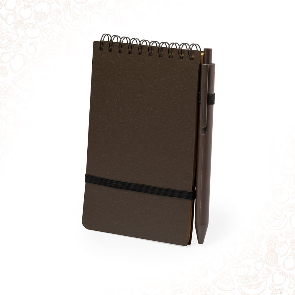 Set di taccuino e penna in fibra di caffè. Quaderno a doppio anello con copertina morbida, chiusura elastica e portapenne. Con 70 pagine e layout a righe singole. Meccanismo a pulsante con inchiostro blu. Include il logo Fibra di Caffè stampato sul taccuino e sulla penna. Presentato in una busta individuale riciclata. La fibra di caffè è ricavata dagli scarti della produzione del caffè. Un’alternativa sostenibile che aiuta a ridurre l’uso della plastica, risparmiando energia nel processo di produzione e promuovendo così la cura dell’ambiente.
