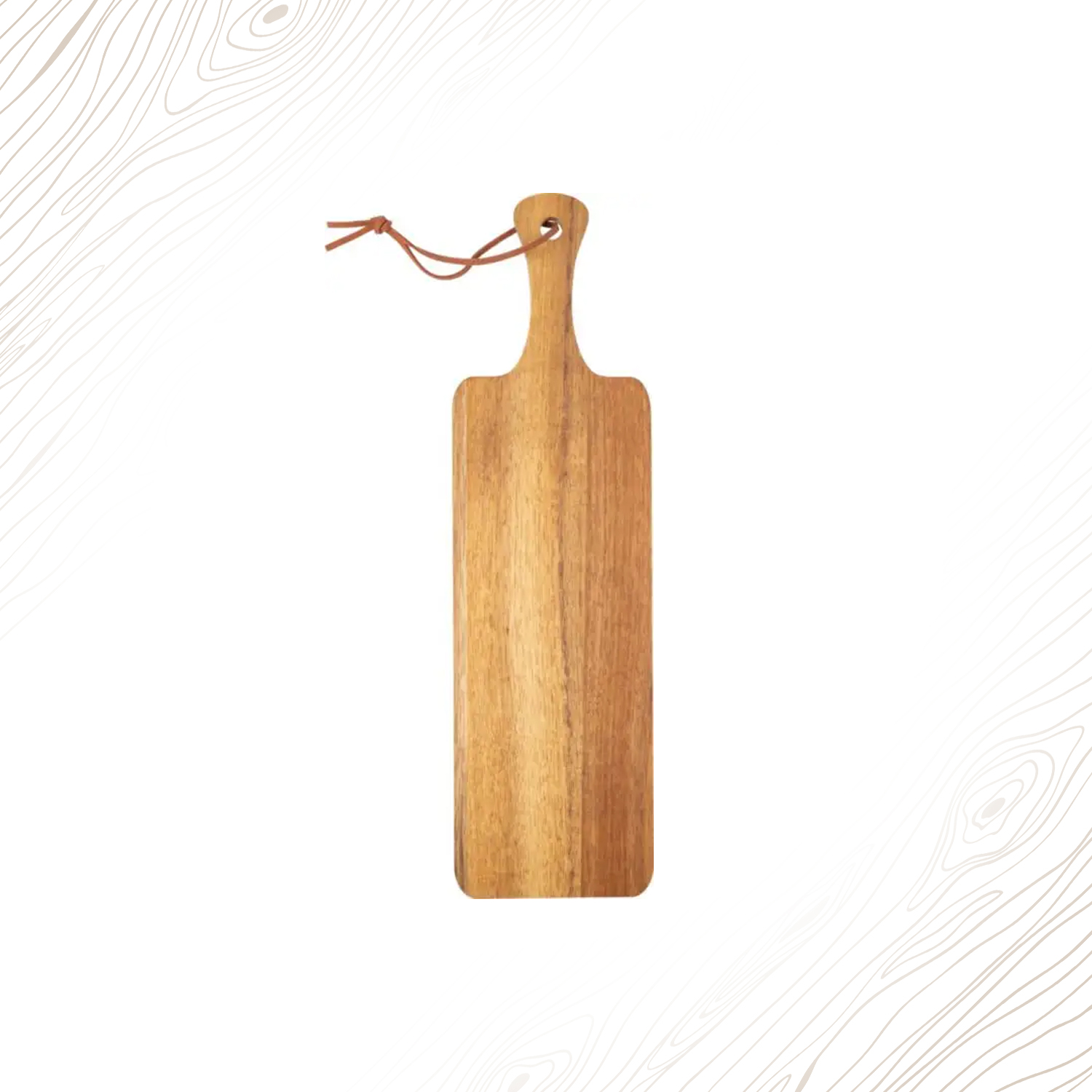 Tagliere in legno di acacia, manico e cordino in PU, confezionato singolarmente in una scatola in cartone avana