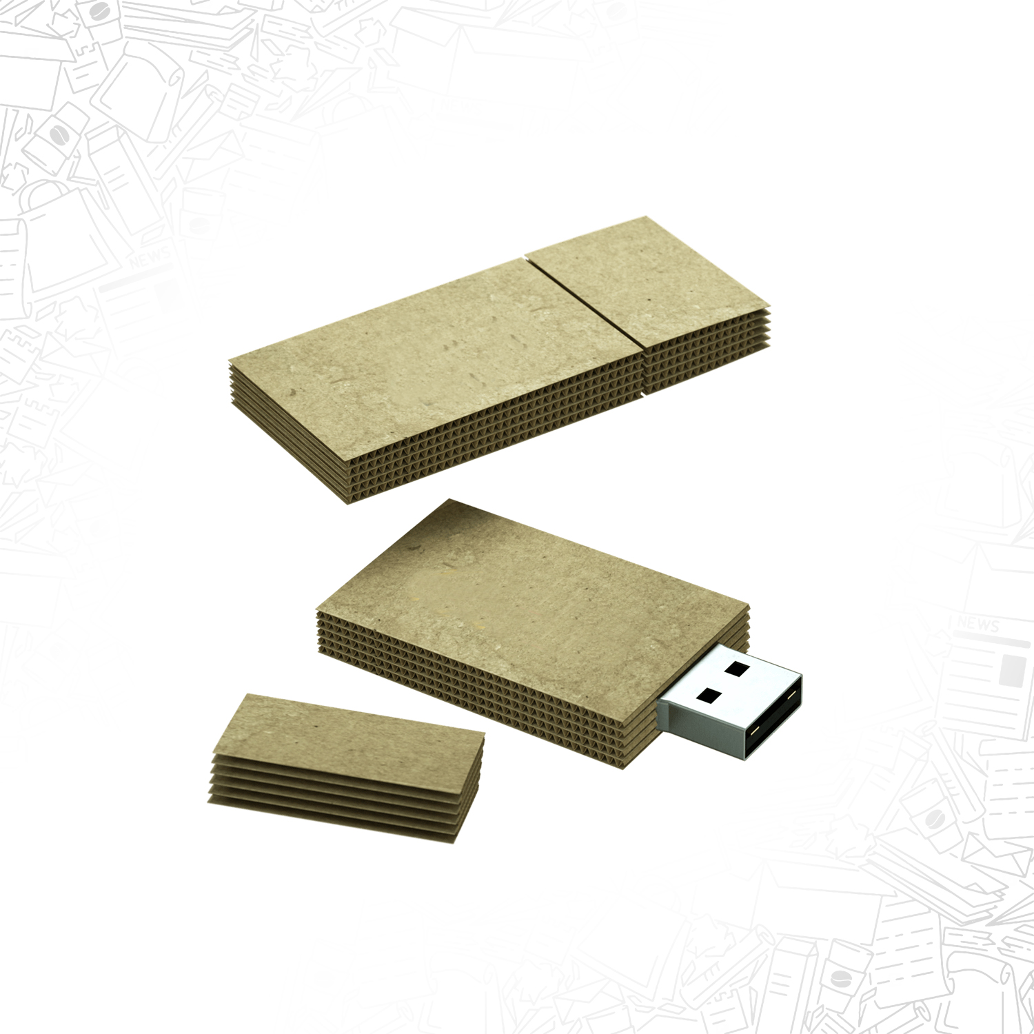 Chiavetta USB ove il chip di memoria è inserito in un cartone ondulato dello spessore di poco più di mezzo centimetro. Il materiale è lo stesso utilizzato solitamente per gli imballaggi ed è costituito da più superfici di carta piana alternata ad una carta ondulata, legate tra loro da collanti naturali.