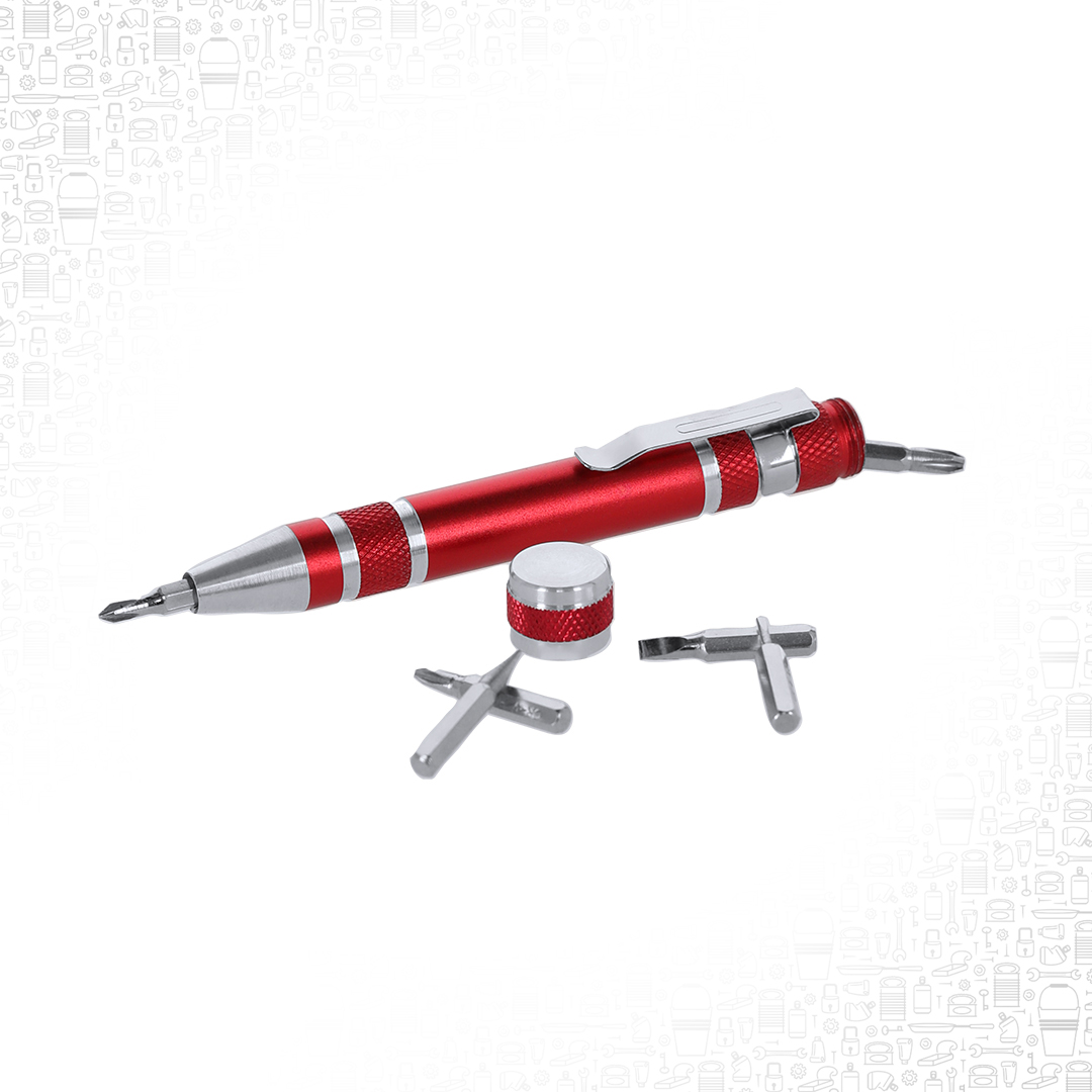 Multi utensile in alluminio con 6 accessori in una gamma di colori metallizzati brillanti. Con corpo antiscivolo e clip in metallo. Include 6 teste di cacciaviti piatti e a croce.